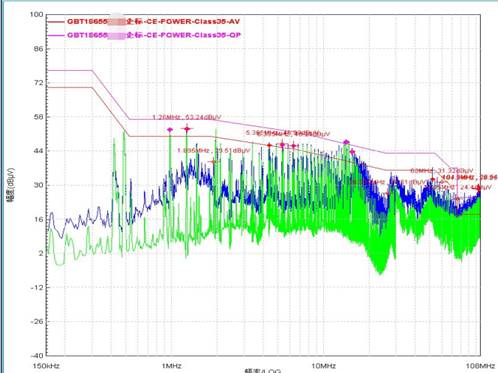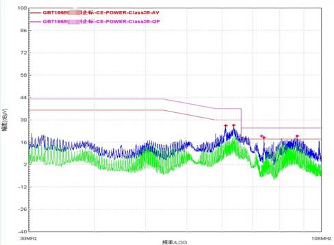 传导发射(电压法):电源线的正极、负极测试结果在80MHz~108MHz频率段的QP值和AV值均超出规定限值线,且以总体包络噪声呈现。